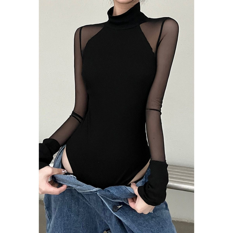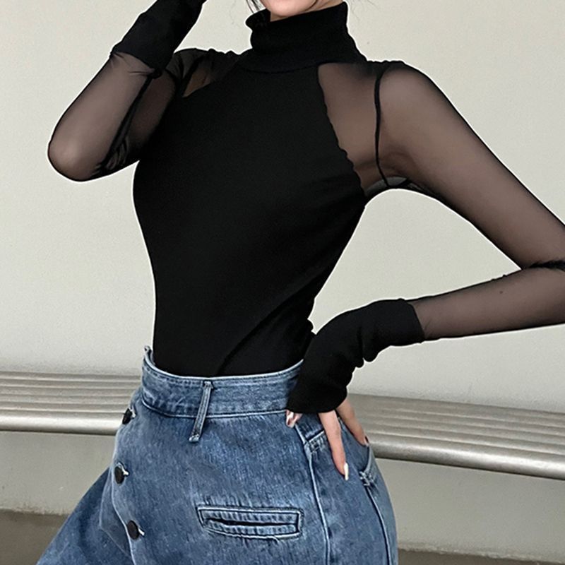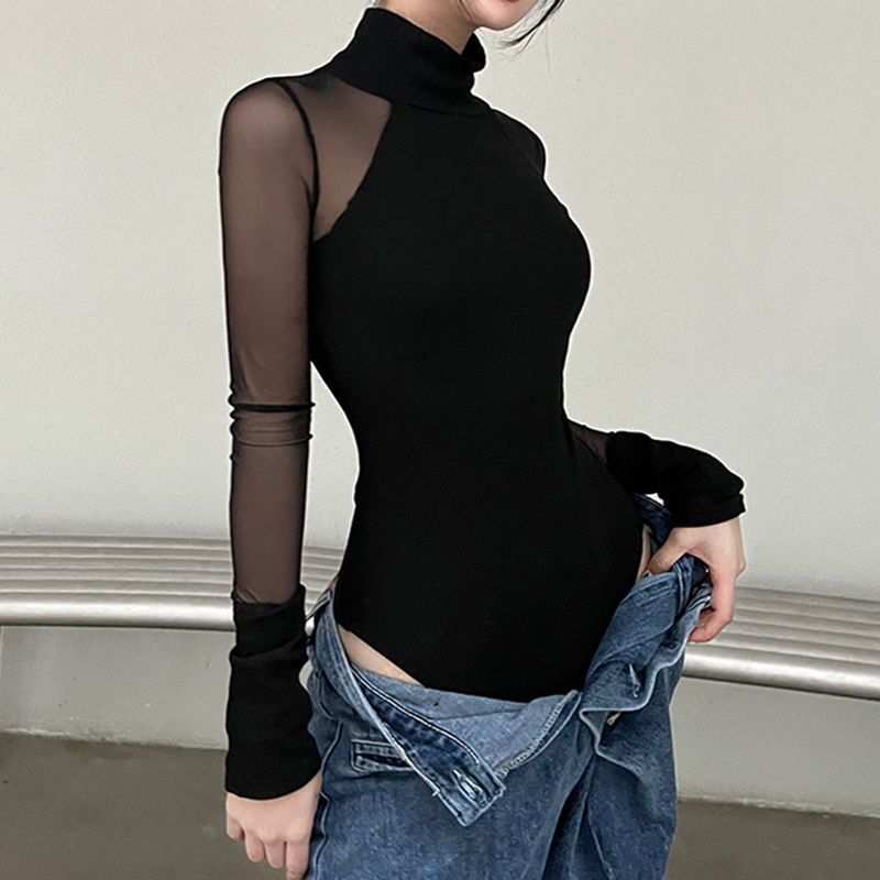 유럽과 미국 스타일의 핫 소녀 스타일 점프 수트 긴팔 티셔츠 여성용 섹시한 메쉬 스티칭 아름다운 뒷면 슬림 이너 베이스 셔츠