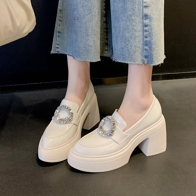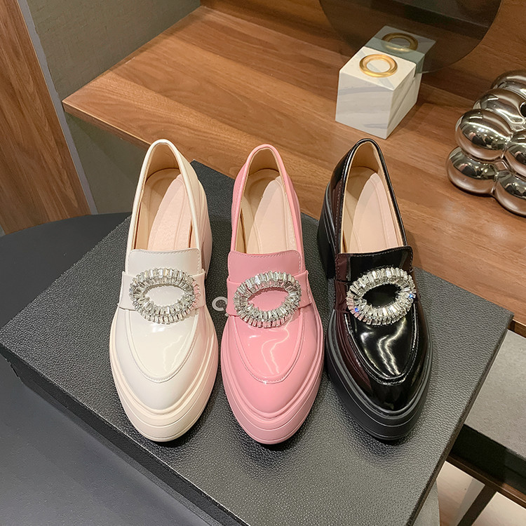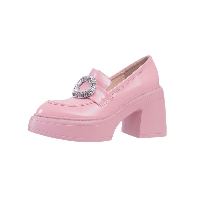 10cm 하이힐 여성용 슬립 온 신발 두꺼운 뒤꿈치 두꺼운 영국 스타일 가죽 신발 핑크 봄 얕은 입 로퍼
