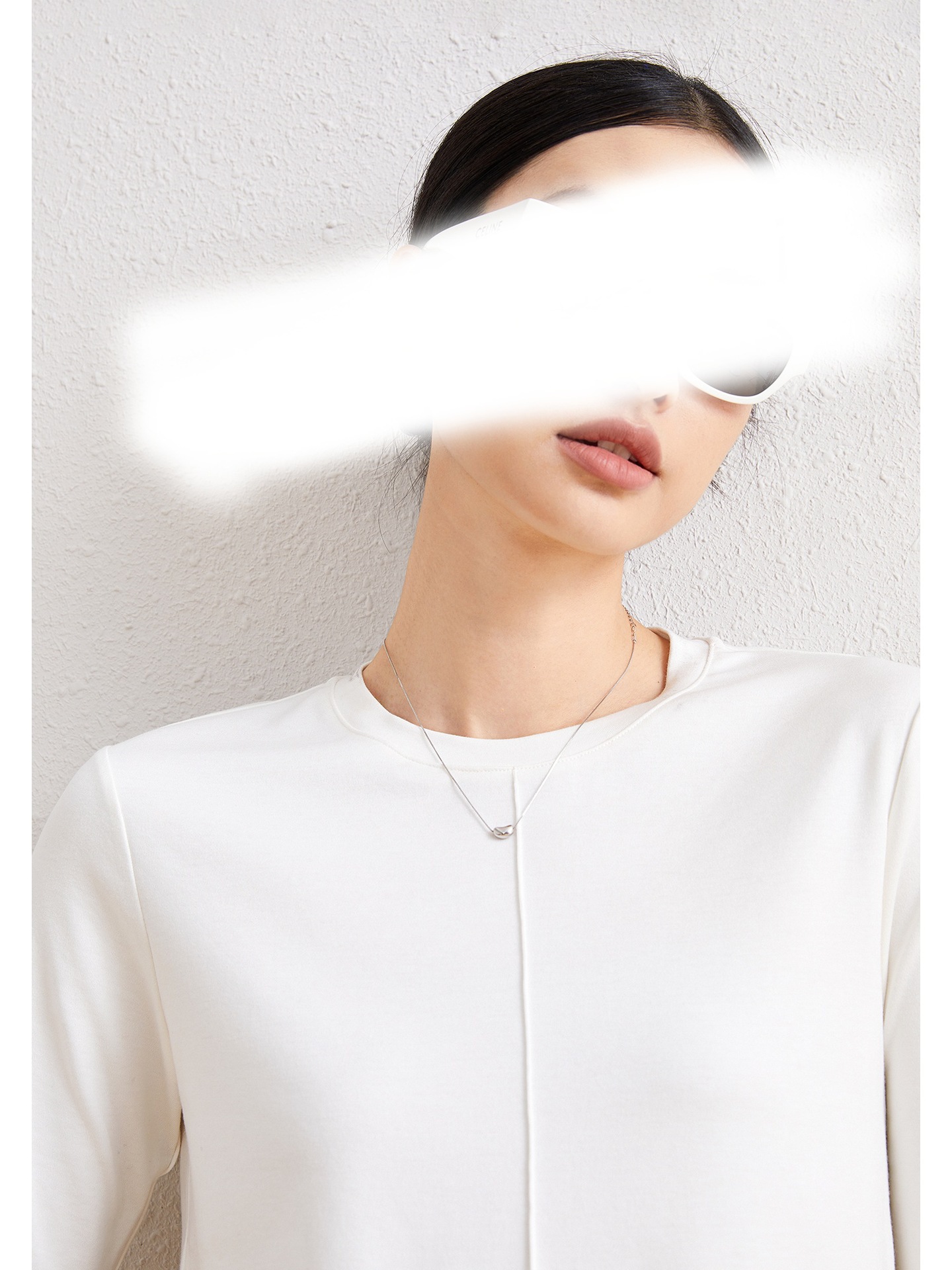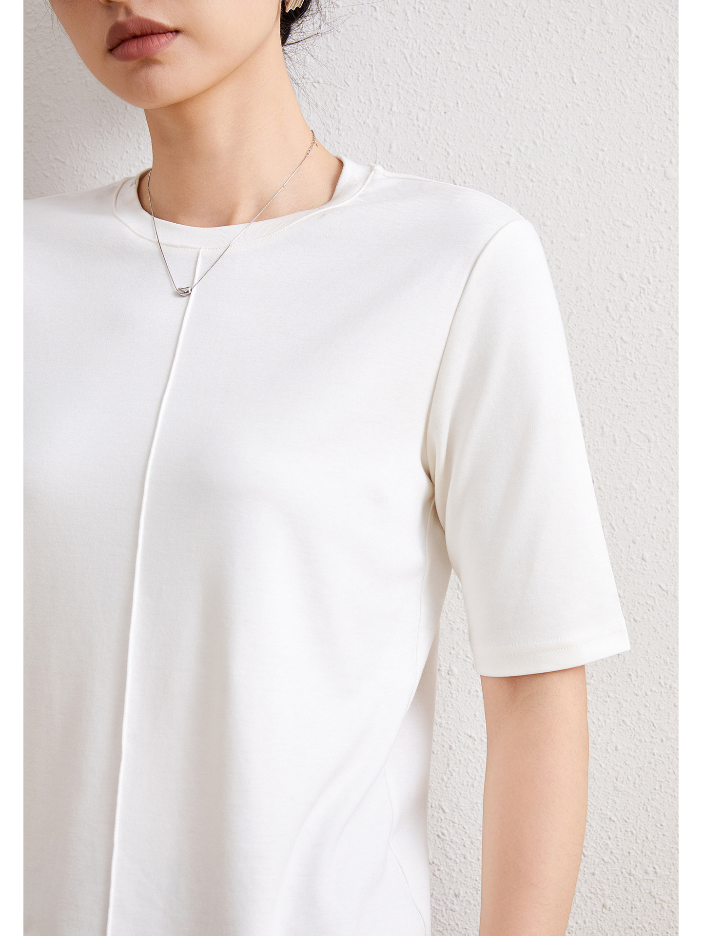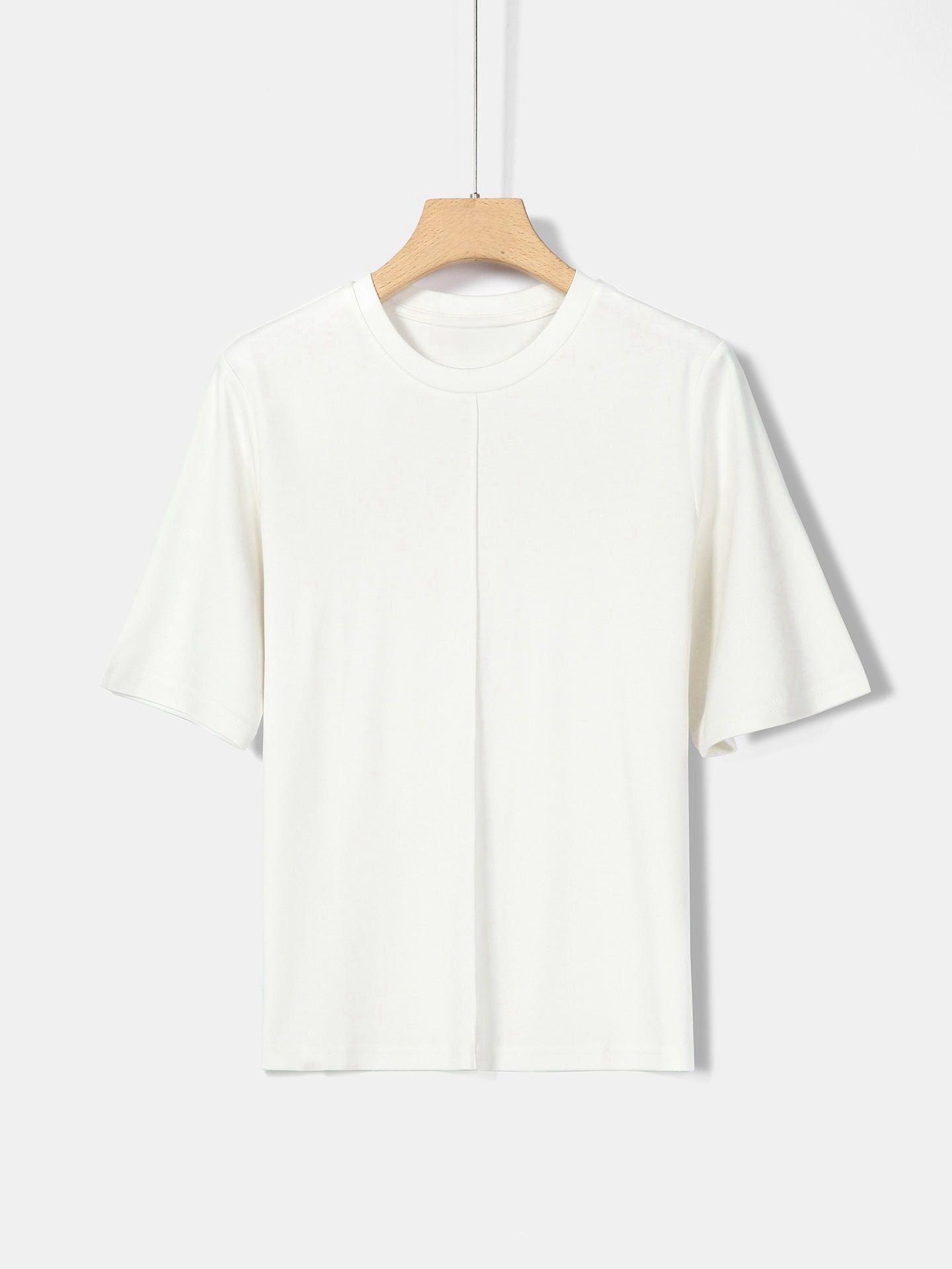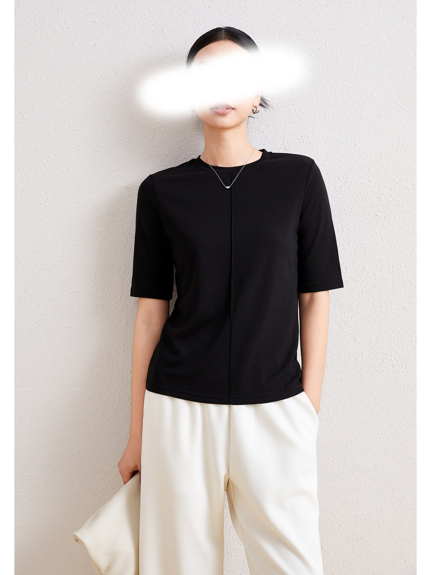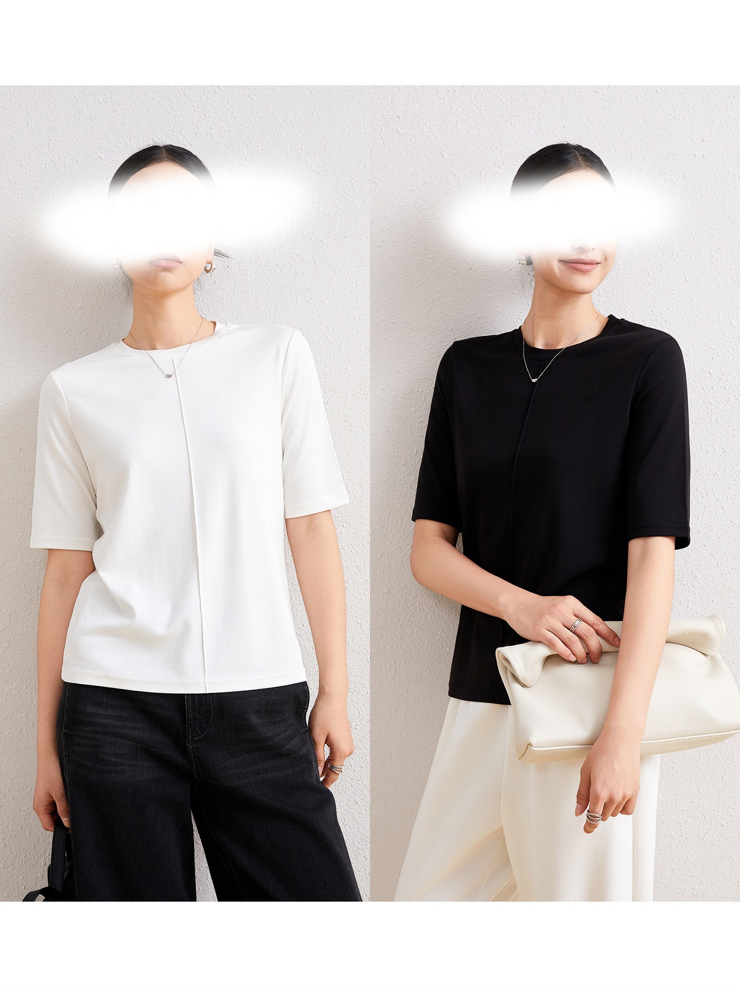 간단한 통근 프론트 미들 스티칭 루즈코튼 티셔츠 여성용 미들 슬리브 하프 하이 칼라 솔리드 컬러 올 매치 미들 칼라 탑 (5 점)