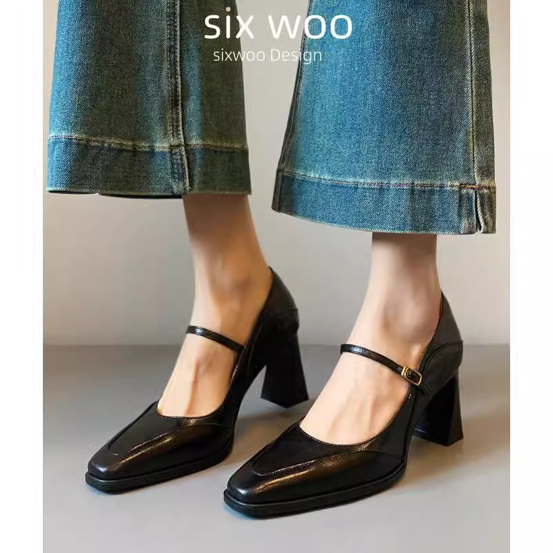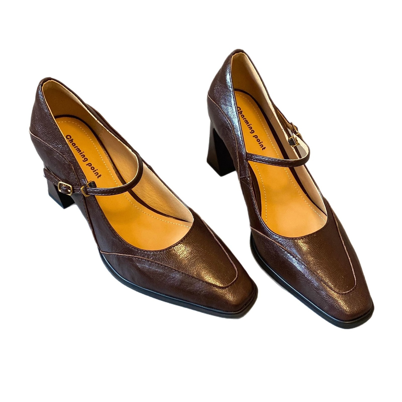 Cowhide 에디션 ~ 정품 가죽 레트로 스퀘어-발가락 메리 제인 신발 여성용 하이힐 슈즈 프렌치 얕은 입 두꺼운 힐 싱글 슈즈