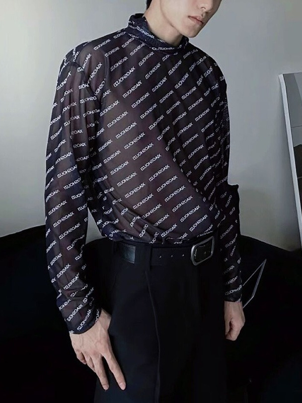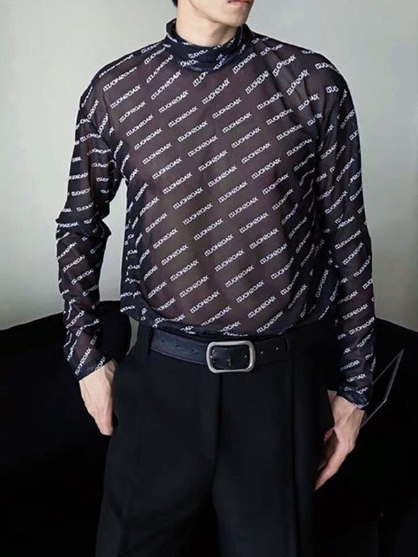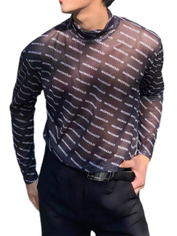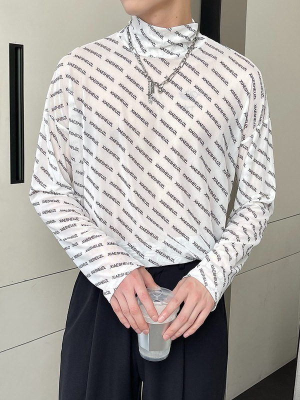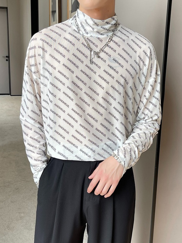 여름 아메리칸 스타일 하이 넥 티셔츠 남성용 거즈 레터 인쇄 통기성 내복 남성용 고급 아이스 실크베이스 셔츠 트렌디