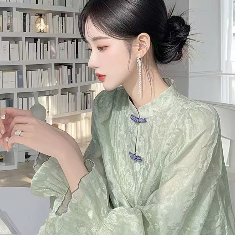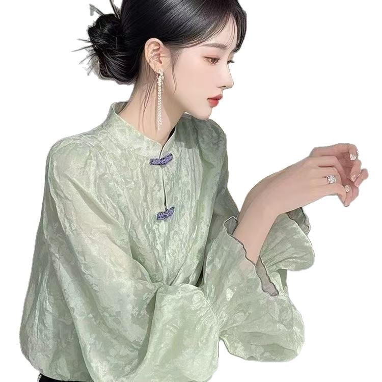 녹색 새로운 중국 스타일 최고 쉬폰 셔츠 2025 봄 새로운 스타일 독특한 아름다운 틈새 골동품 탑