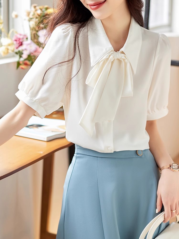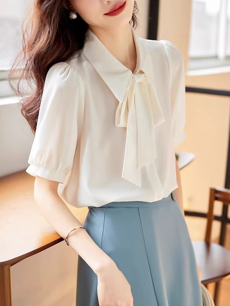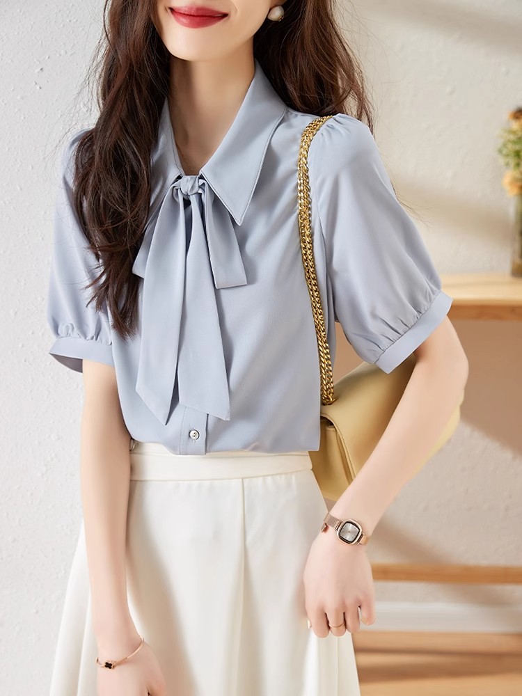 연기 블루 쉬폰 반팔 셔츠 여성 의류 여름 작은 draped 한국 스타일 최고 부드러운 스타일 셔츠 통근