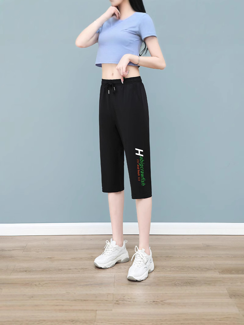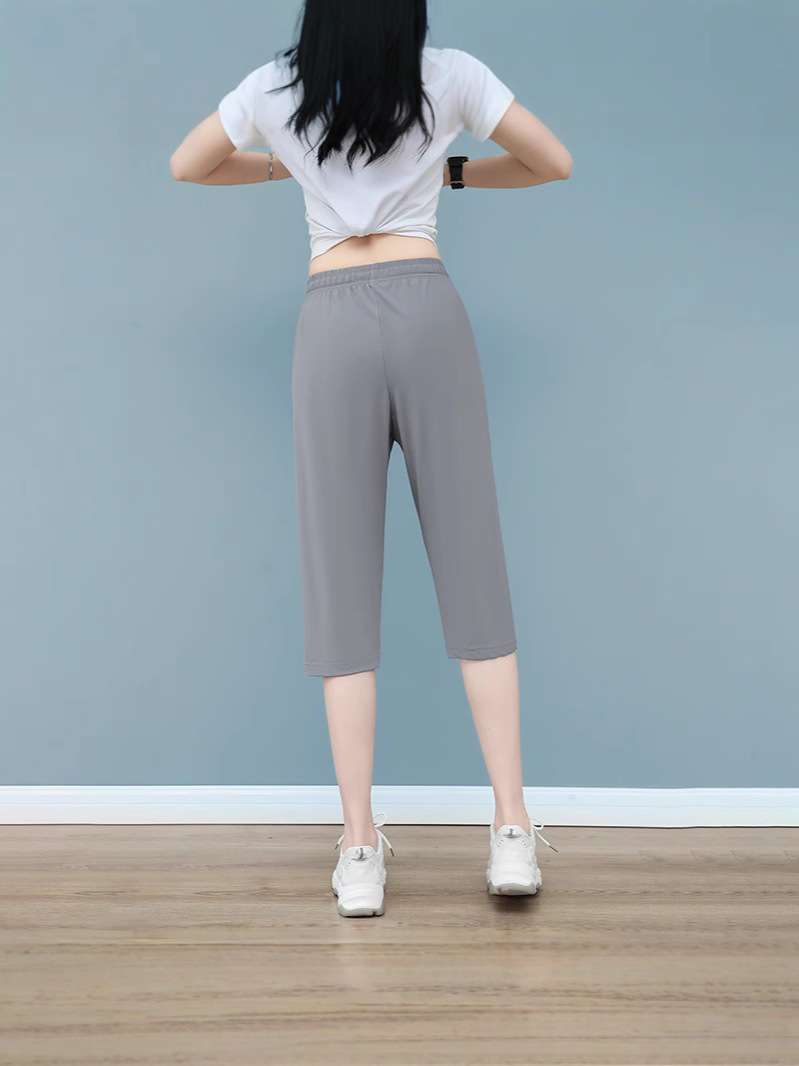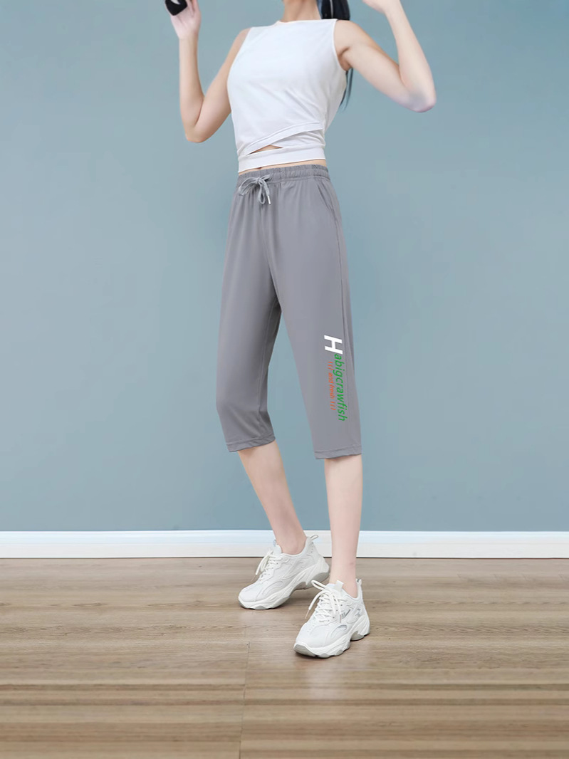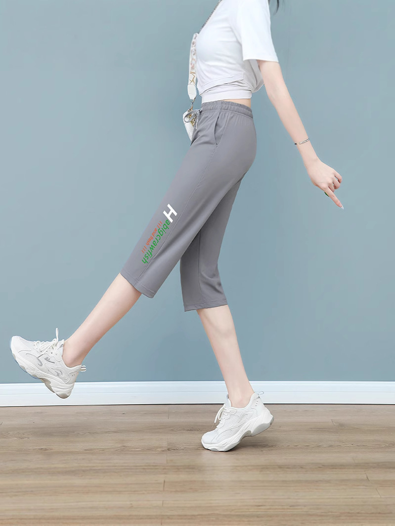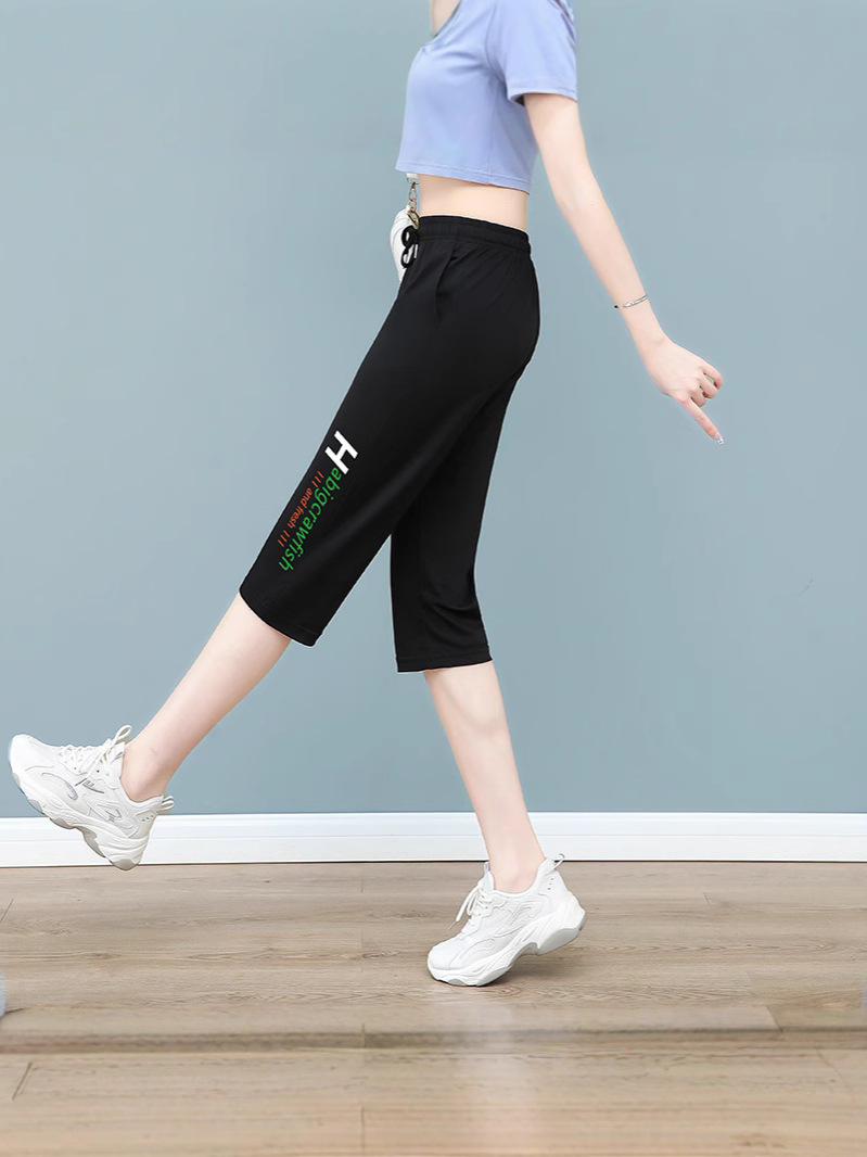 여성용 크롭 팬츠 여름 아이스 실크 속건성 얇은 프린트 루즈 캐주얼 스포츠 바지 슬리밍 바지 7점 미디엄 팬츠