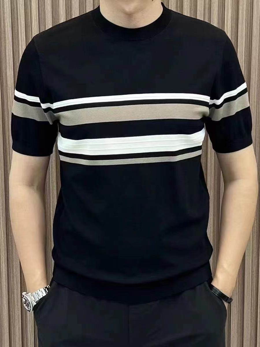 2025 여름 새로운 패션 라운드 넥 남성 짧은 소매 티셔츠 스트라이프 콘트라스트 컬러 캐주얼 트렌디 핸섬 니트 하프 슬리브