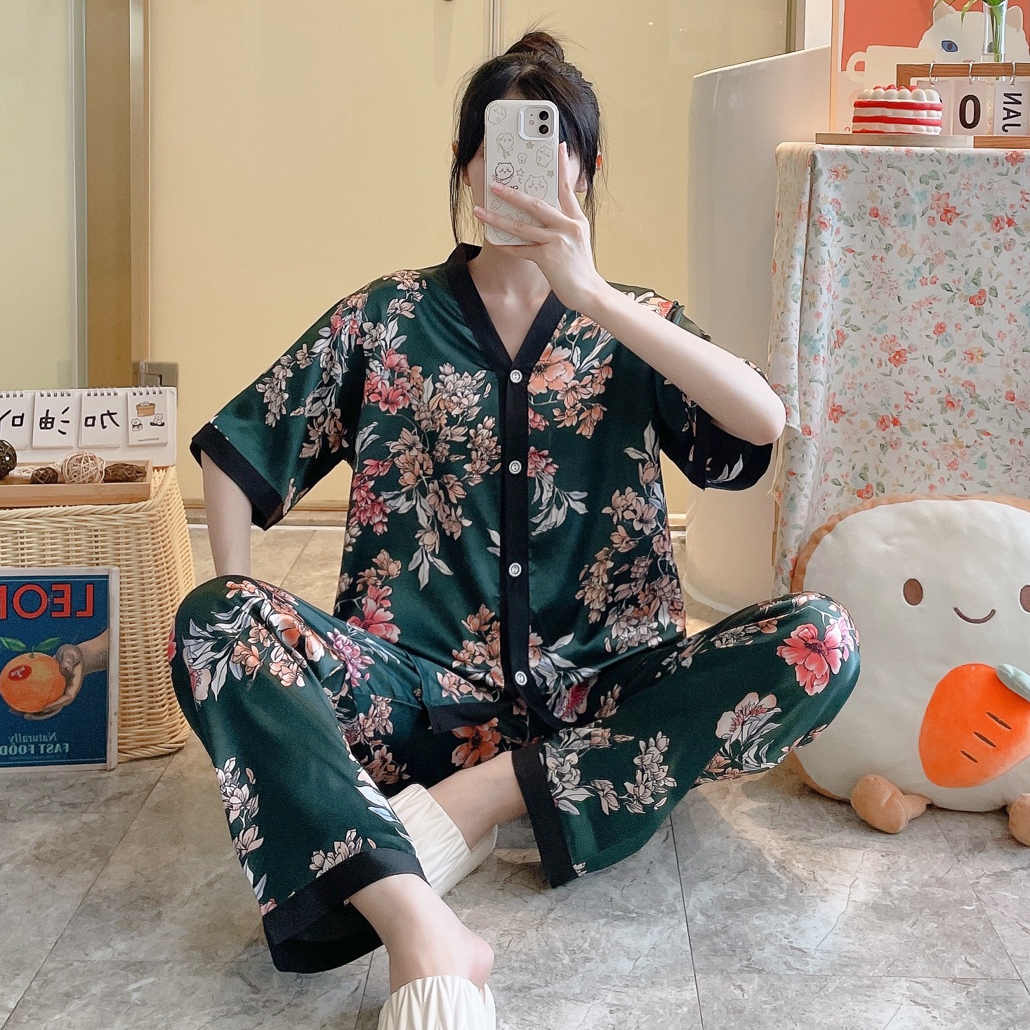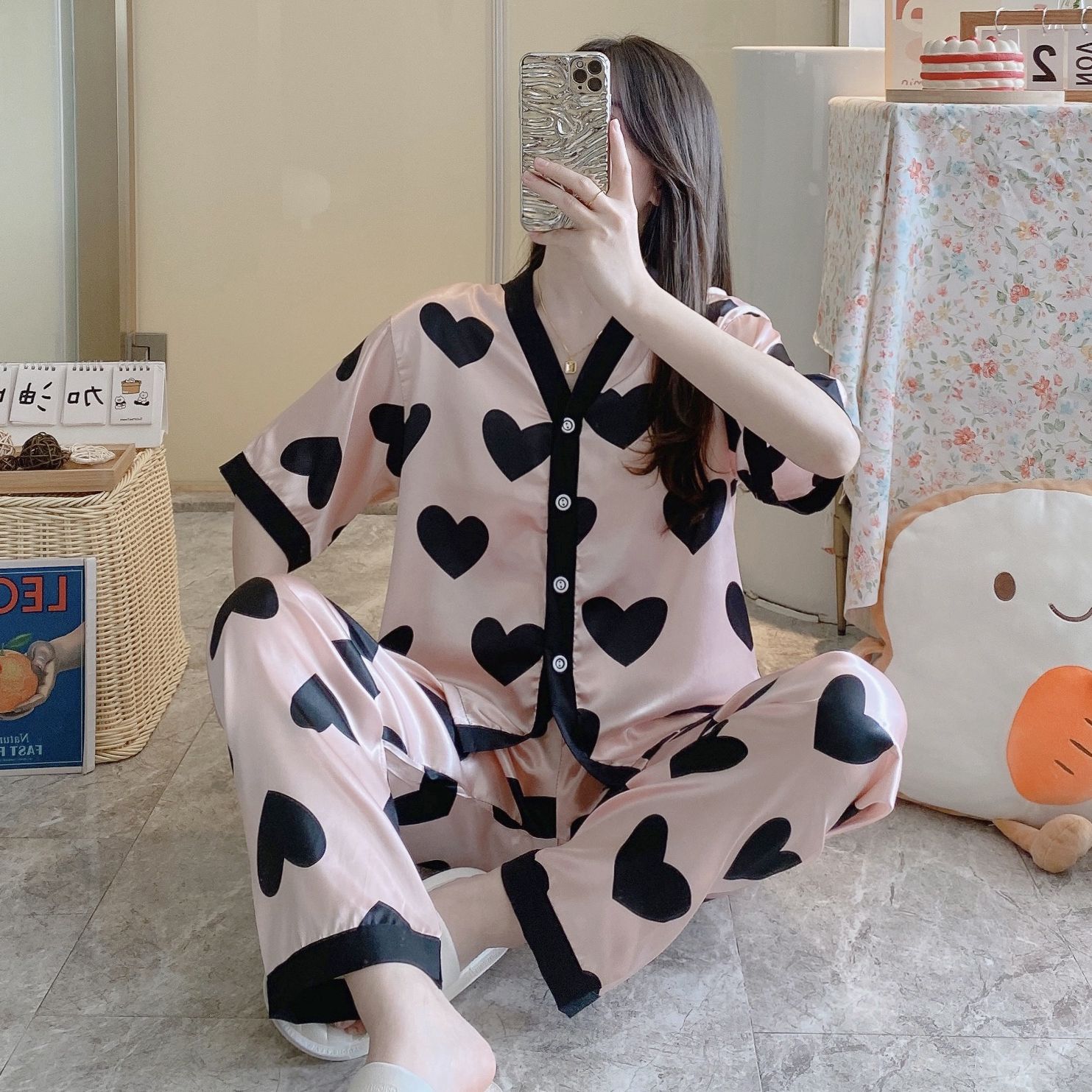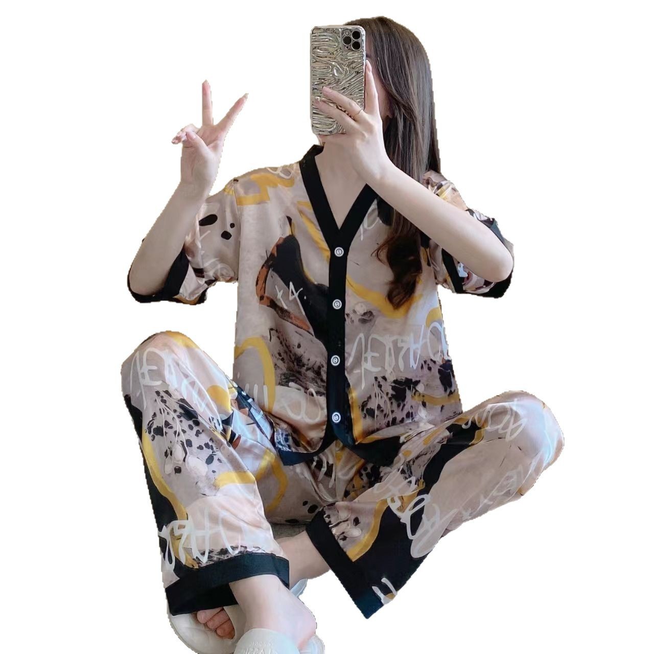 공장 국경 파자마 여성 인쇄 실크 봄과 가을 반팔 바지 카디건 새 집 옷 세트 아이스 실크