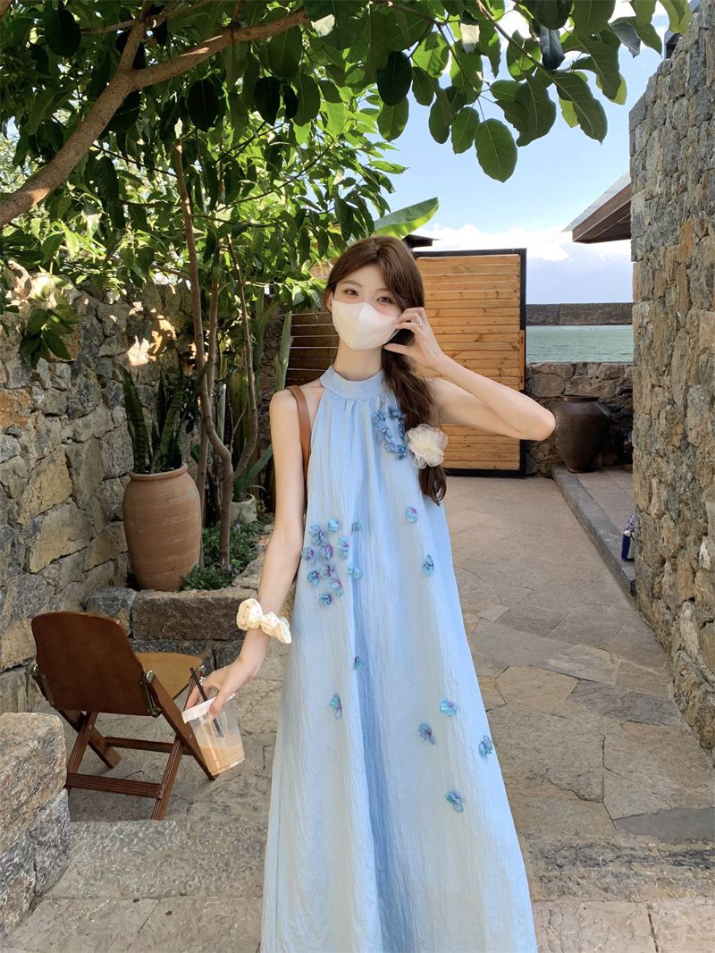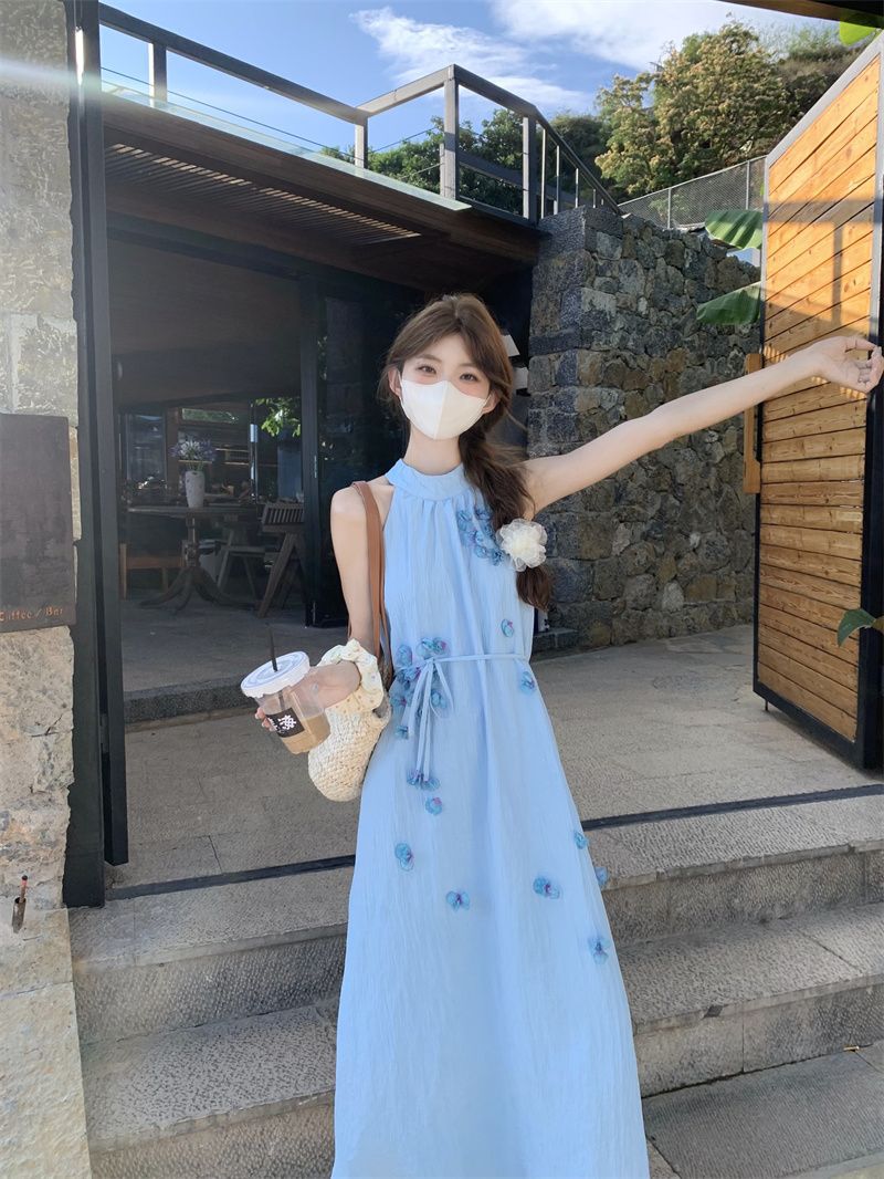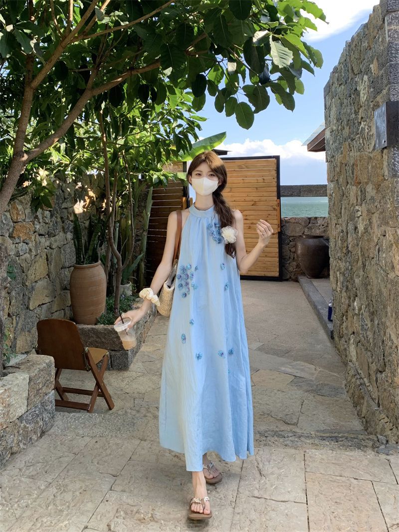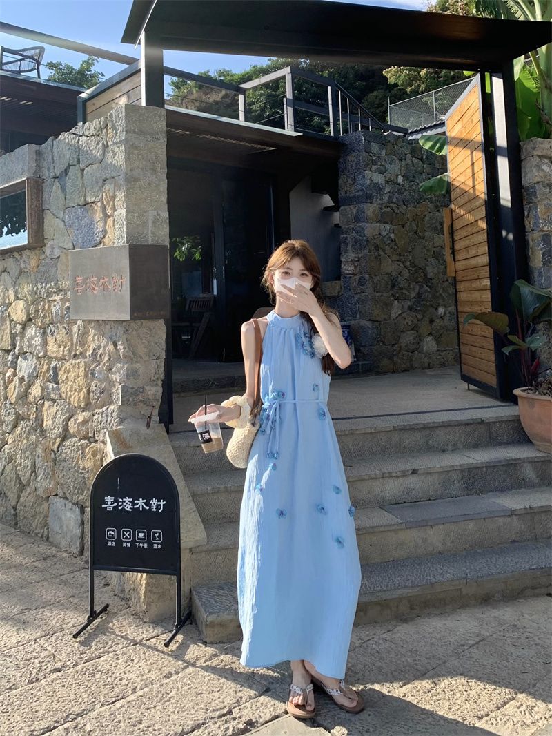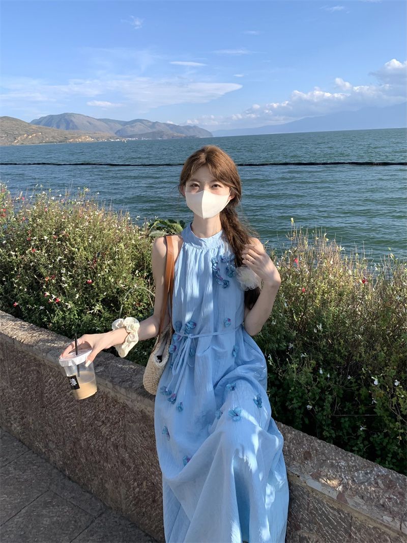 블루 넥 민소매 원피스 여성용 여름 도파민웨어 하이 엔드 해변 원피스
