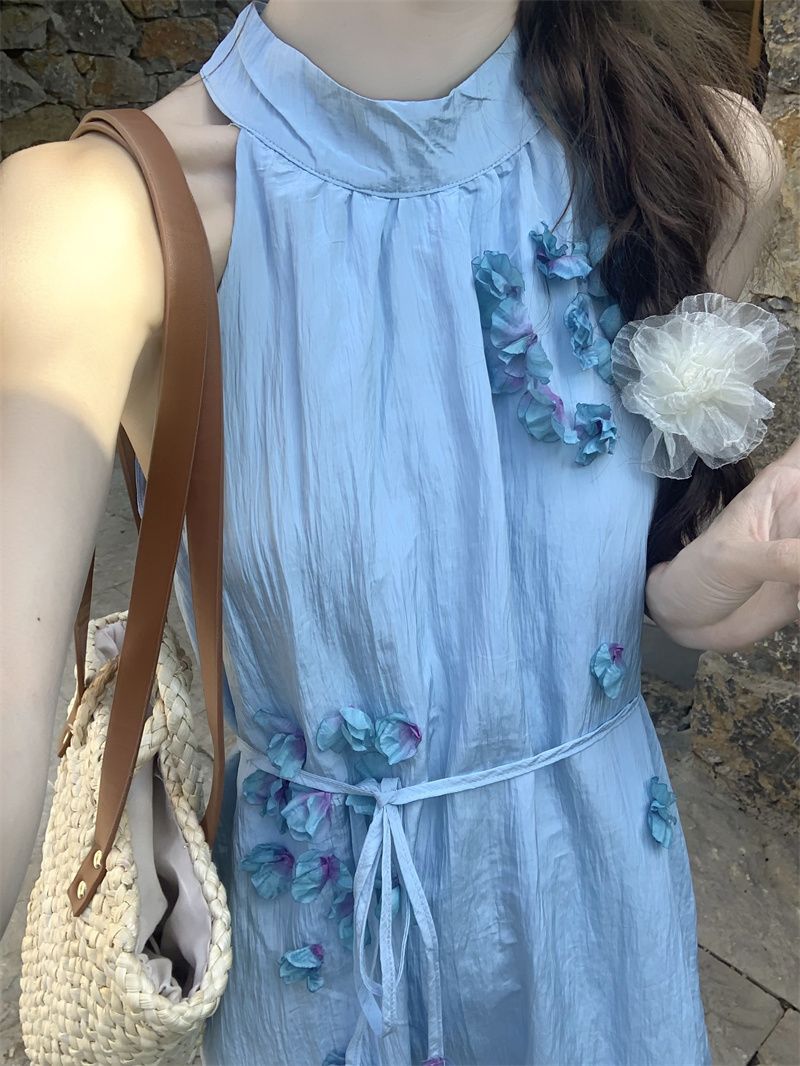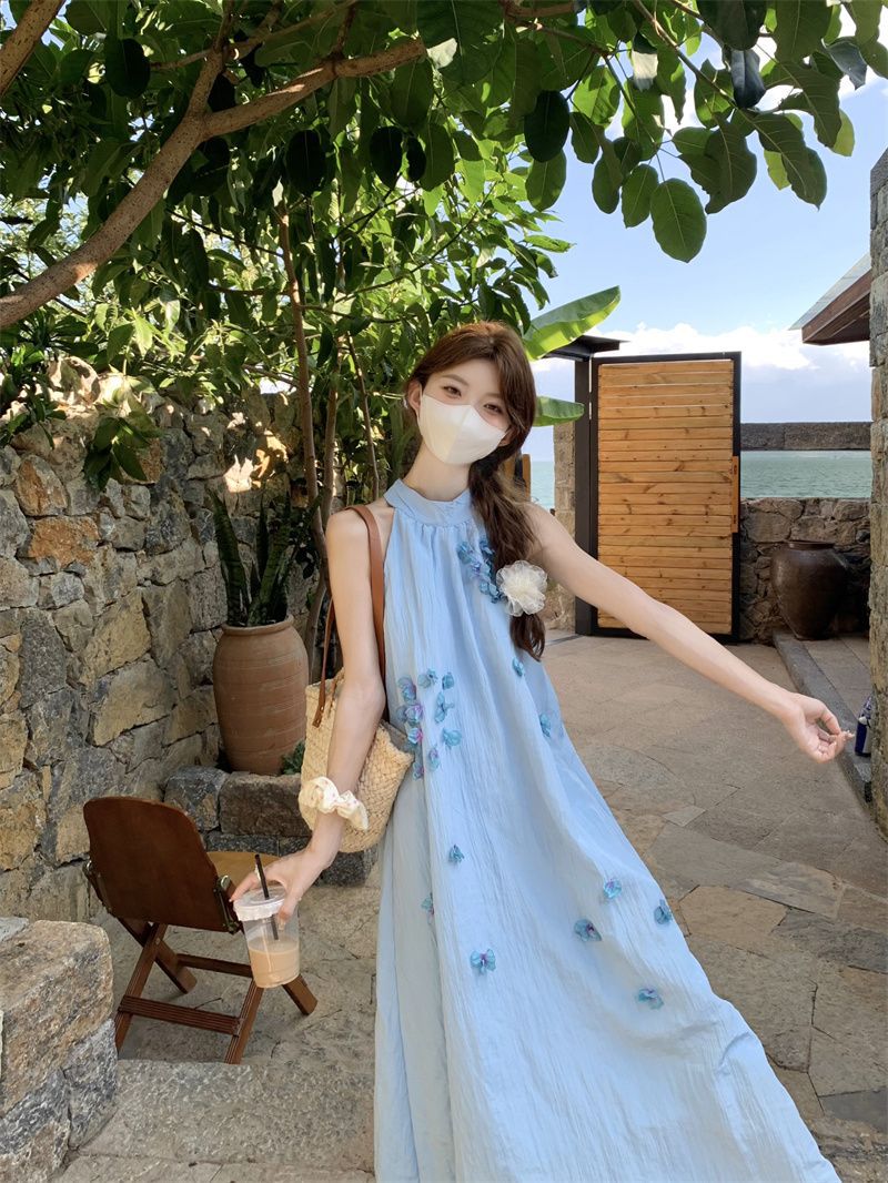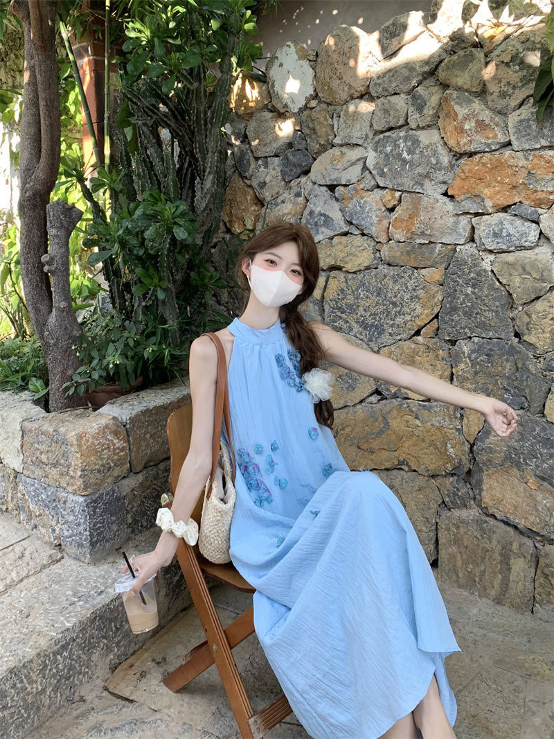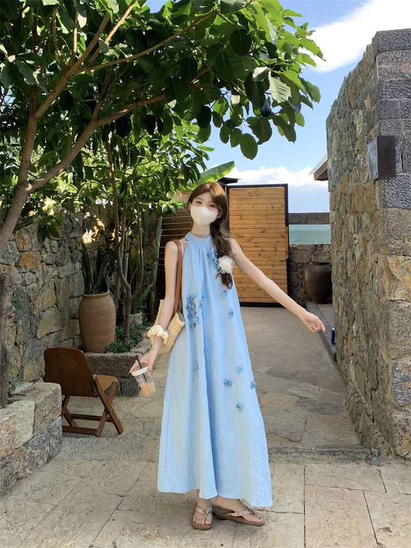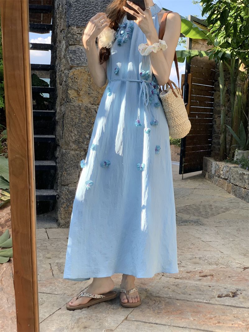 블루 넥 민소매 원피스 여성용 여름 도파민웨어 하이 엔드 해변 원피스