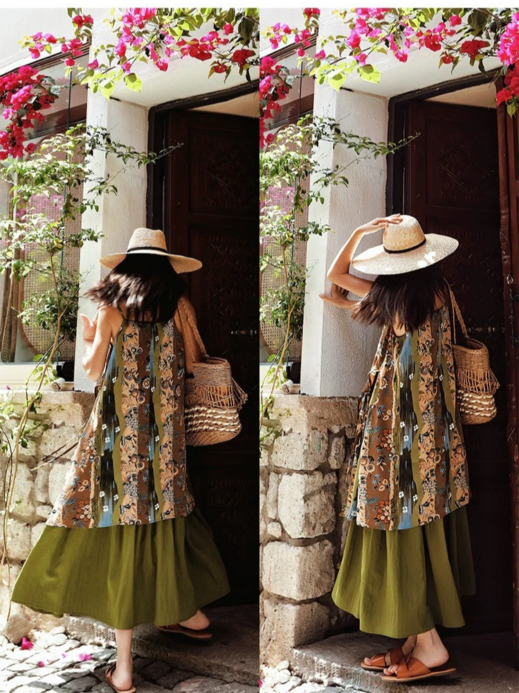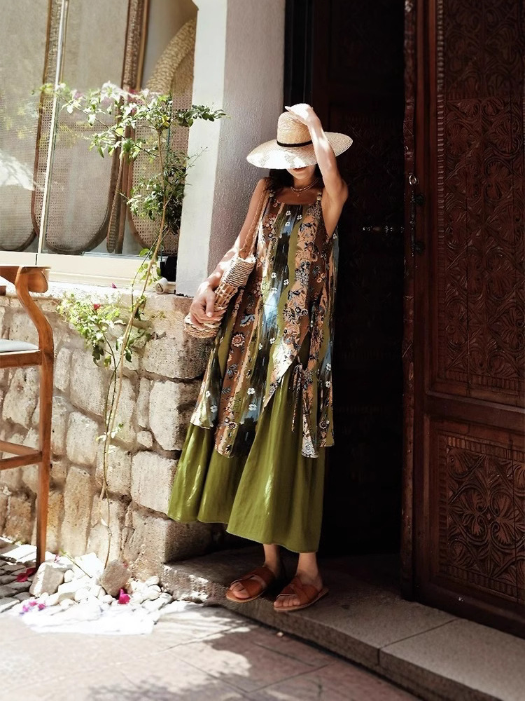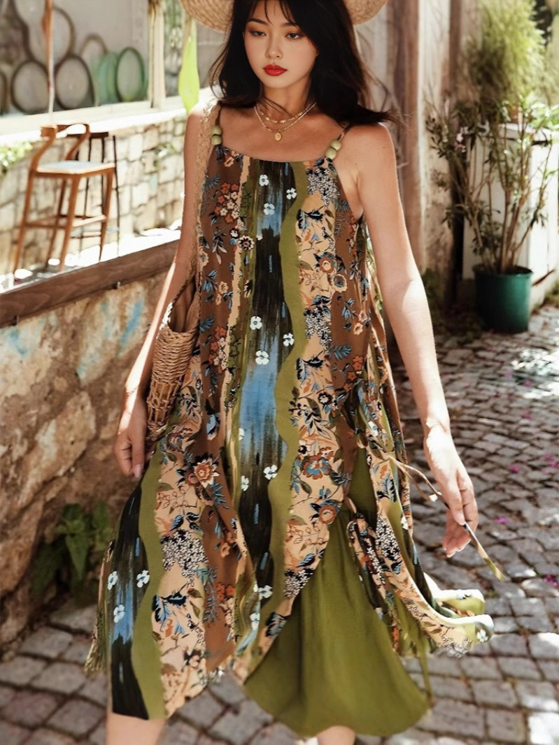재고 민족 유화 인쇄 된 구슬 슬립 스커트 가짜 2 조각 인쇄 비치 스커트 여행 휴일 원피스