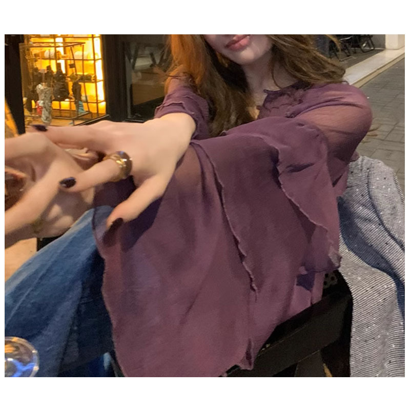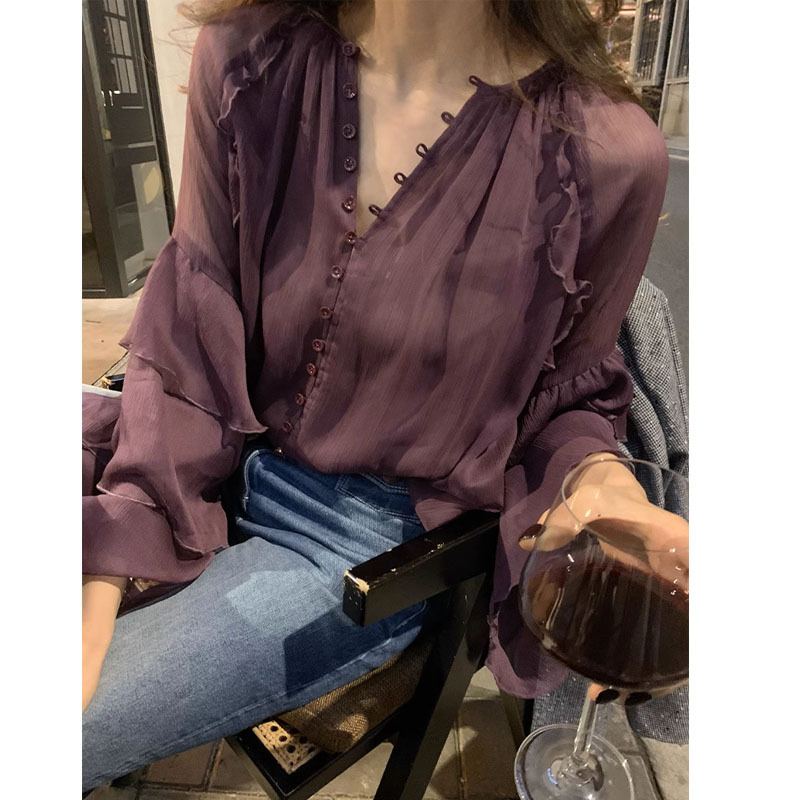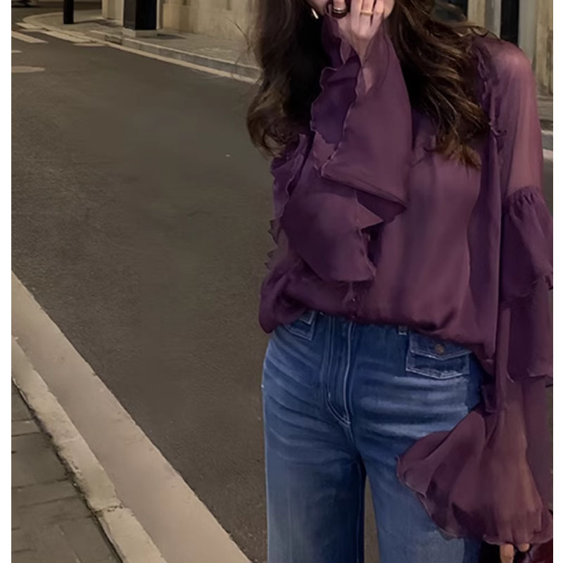 가벼운 럭셔리 하이 엔드 쉬폰 셔츠 여성의 봄과 여름 루즈 러플 퓨어 트럼펫 슬리브 셔츠 톱 2025 새로운 여성