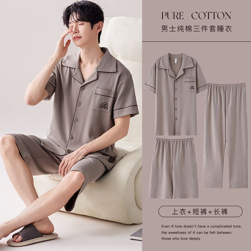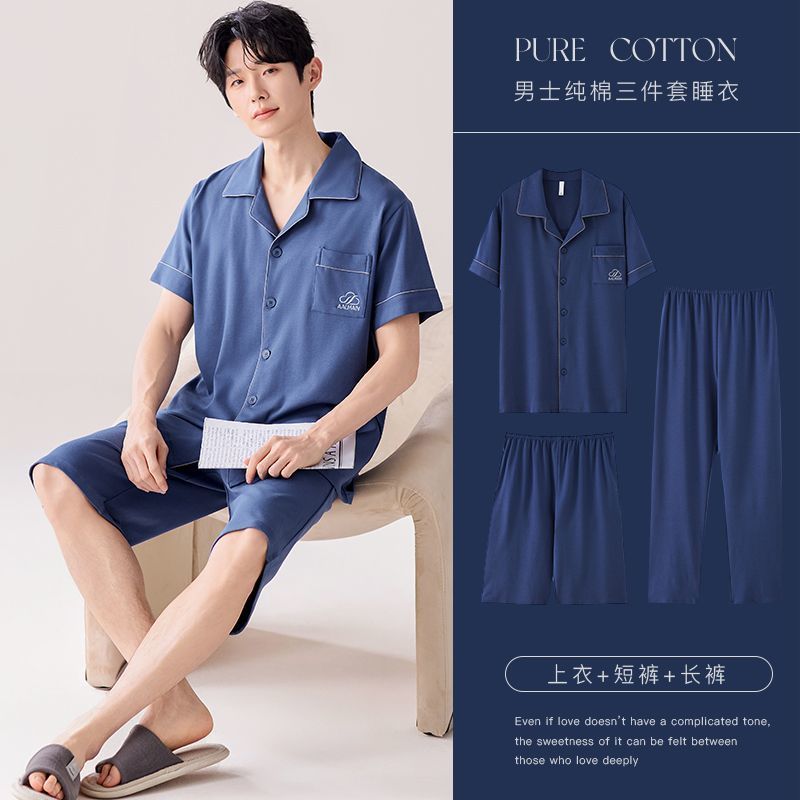 순면 남성 잠옷 봄과 여름 반팔 반바지 바지 아빠의 집 옷은 3 피스 세트 착용 할 수 있습니다