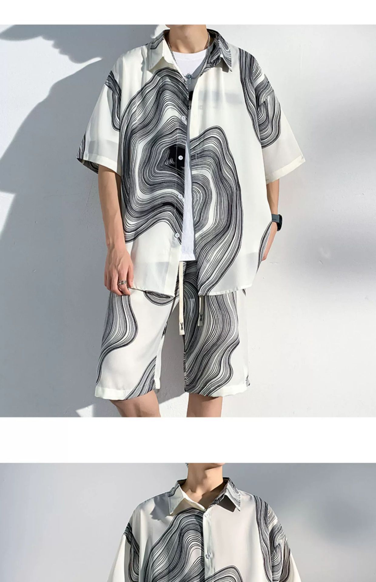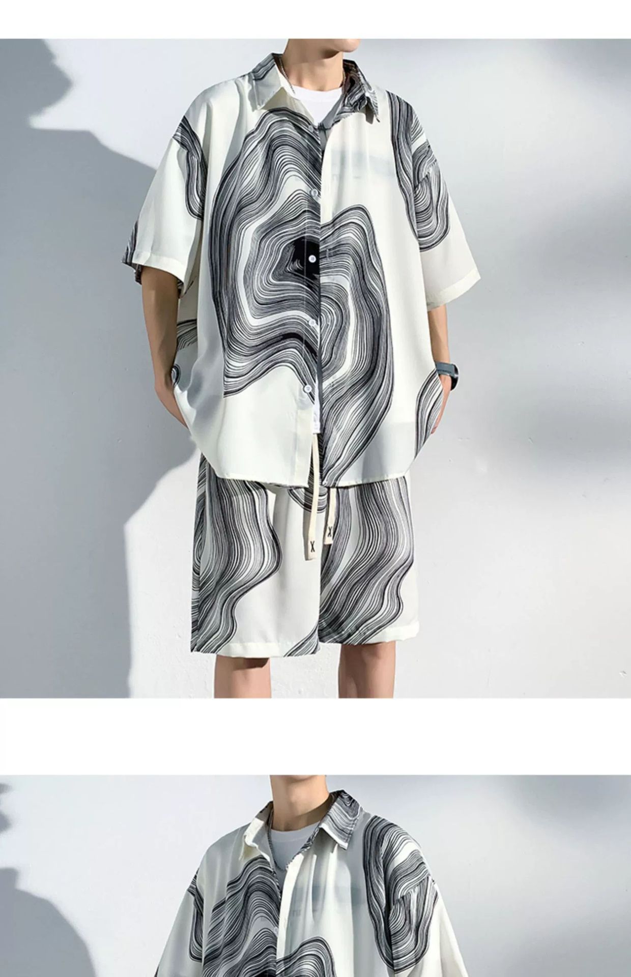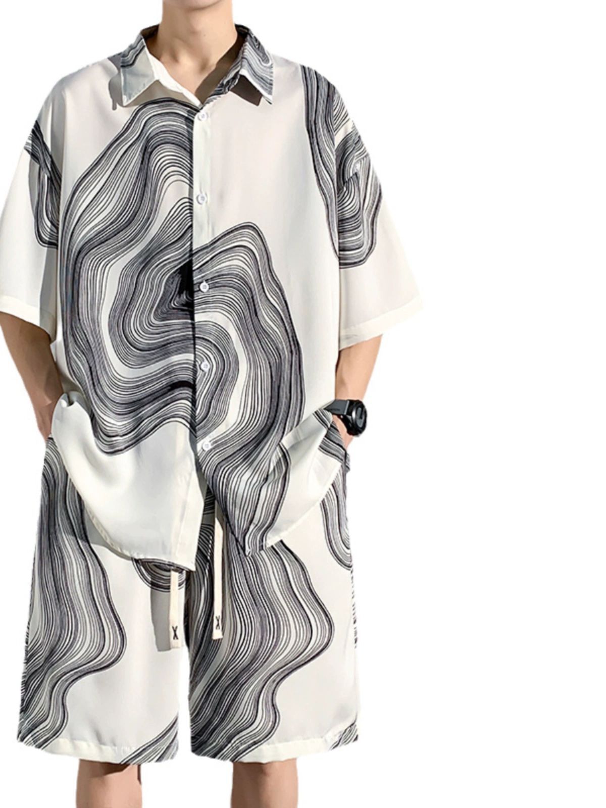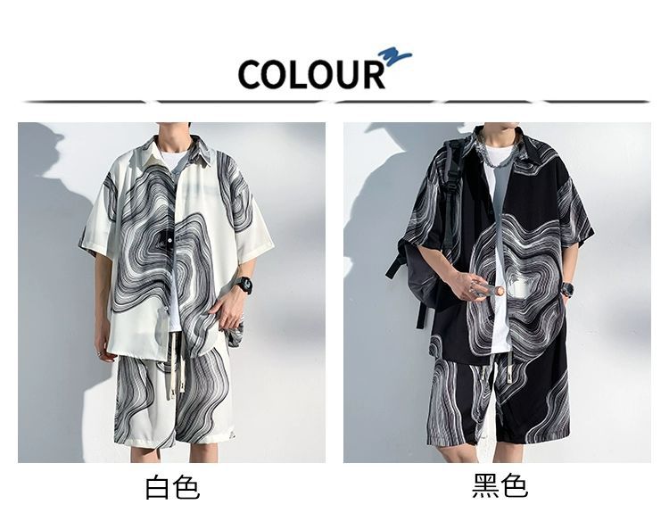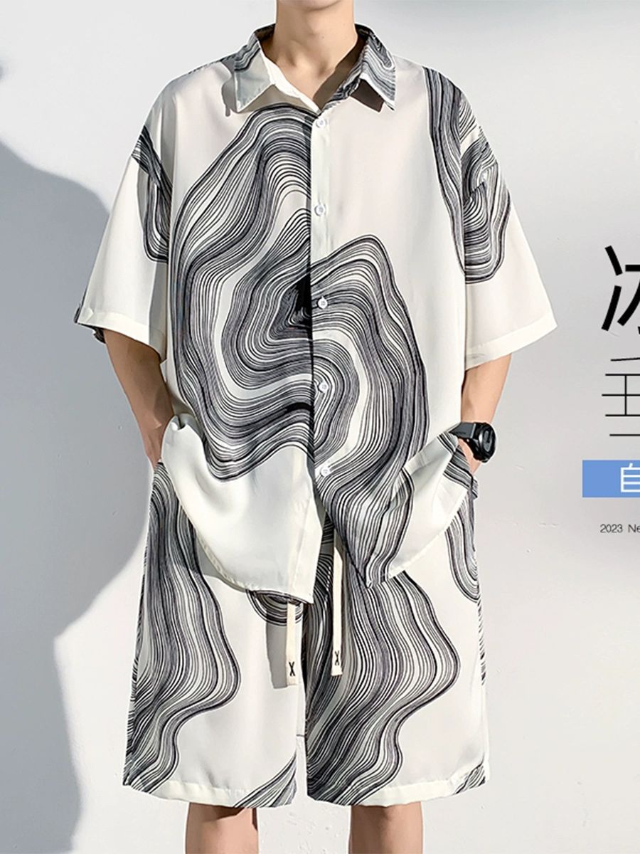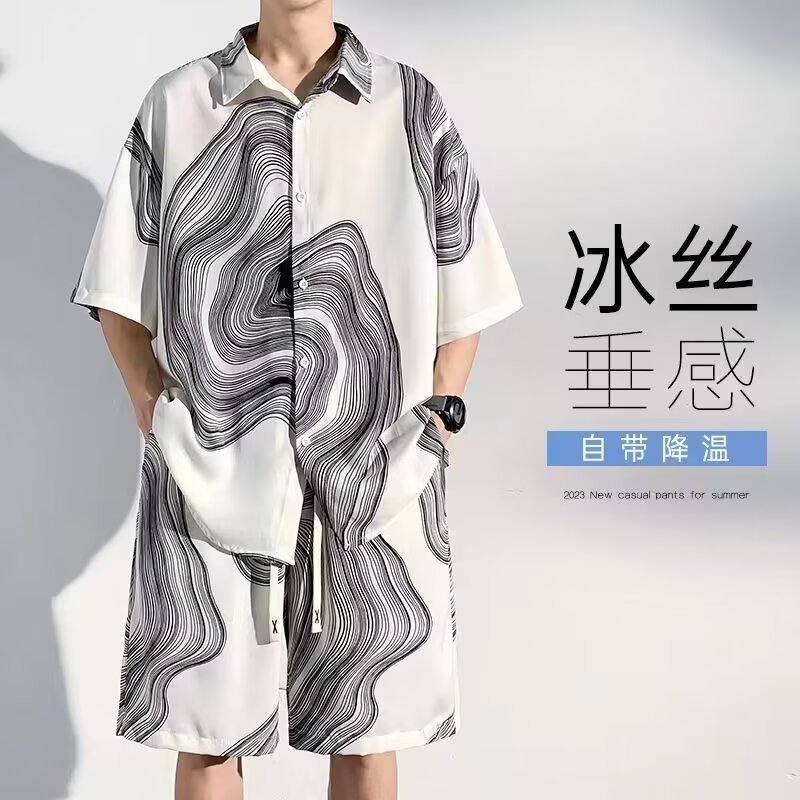 아이스 실크 비치 셔츠와 반바지 남자 여름 세트 2024 새로운 여름 느슨한 플러스 사이즈 남자 캐주얼