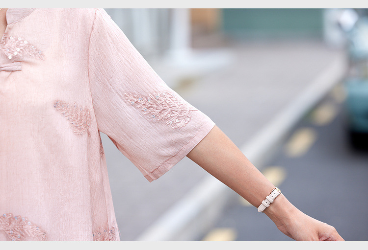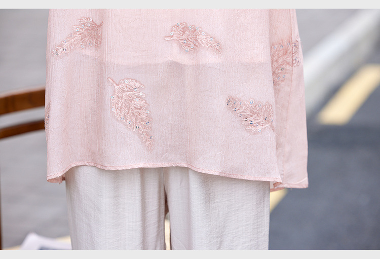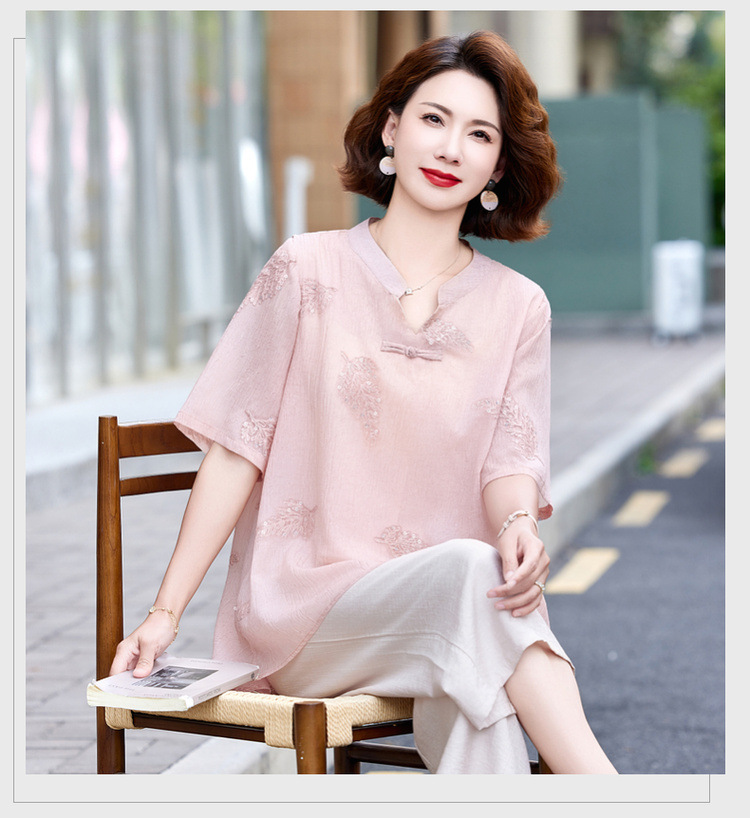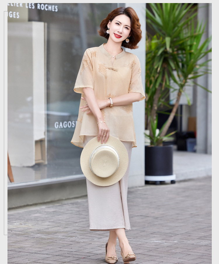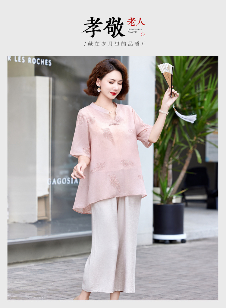 중년 어머니 여름 원피스 세트 쉬폰 작은 셔츠 기질 중년 여성 여름 7 소매 국가 스타일 루즈 탑