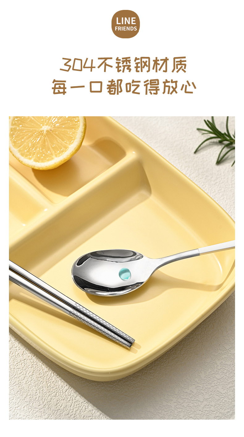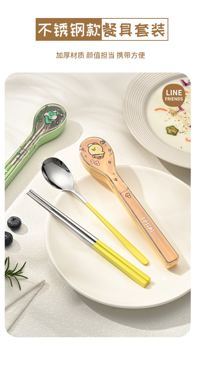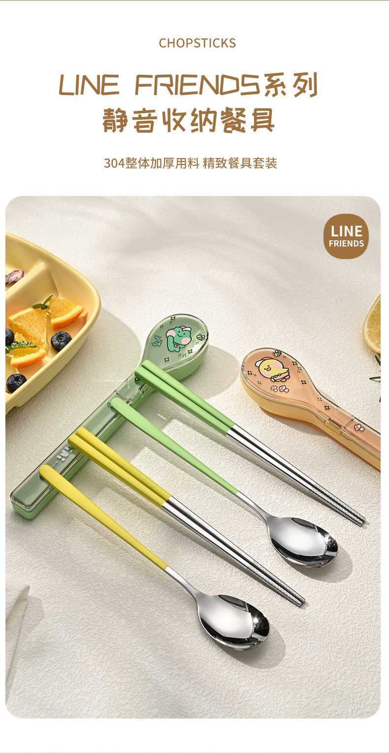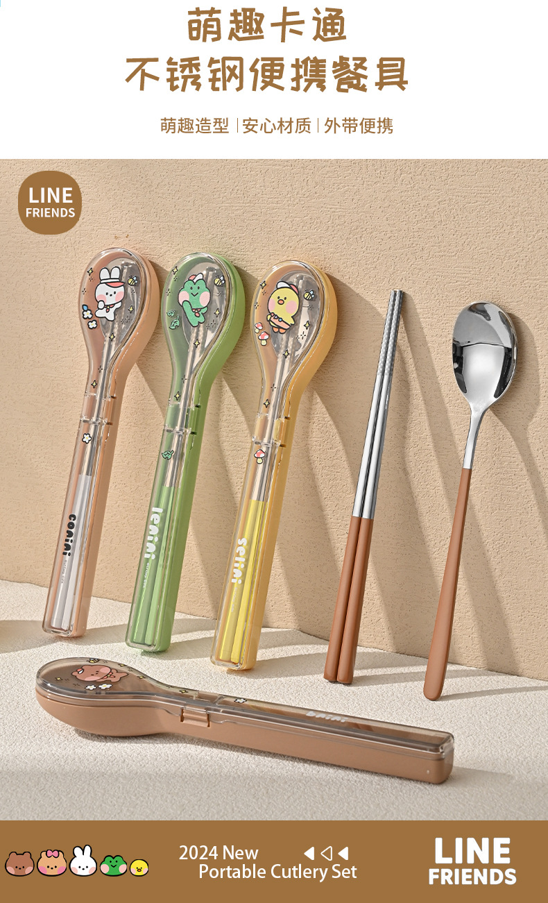 LINEFRIENDS 스테인레스 스틸 스푼 젓가락 휴대용 테이크 아웃 식기 학생 어린이 304 스푼 젓가락 세트