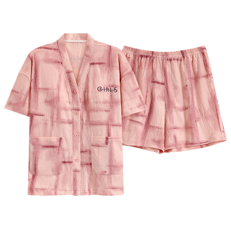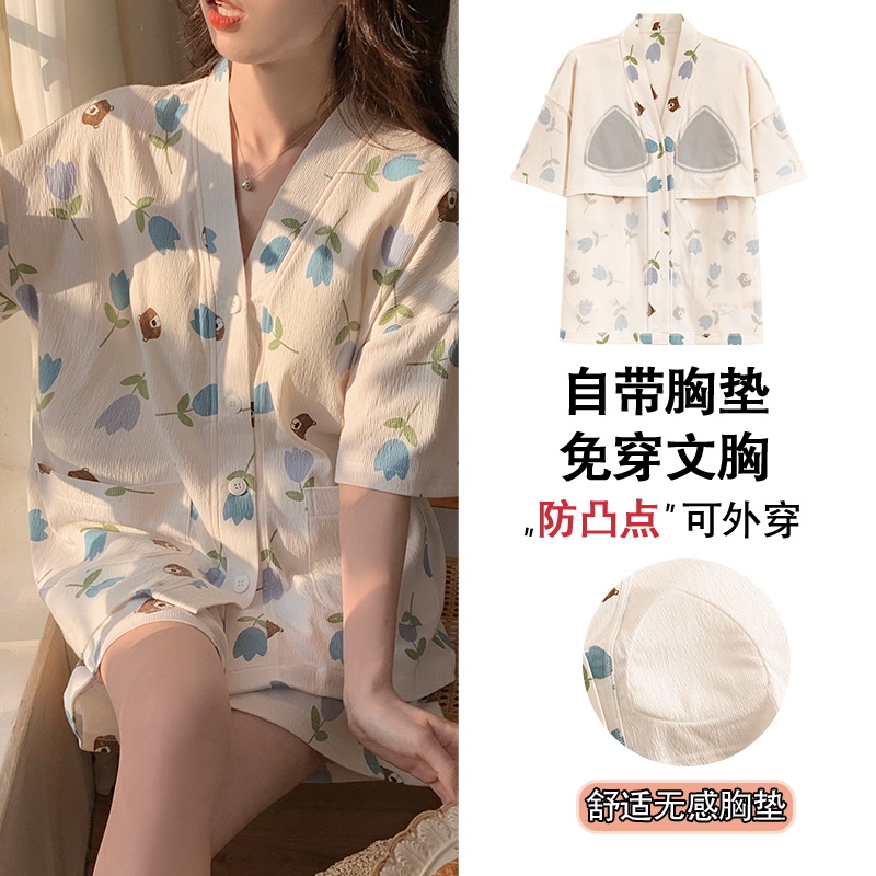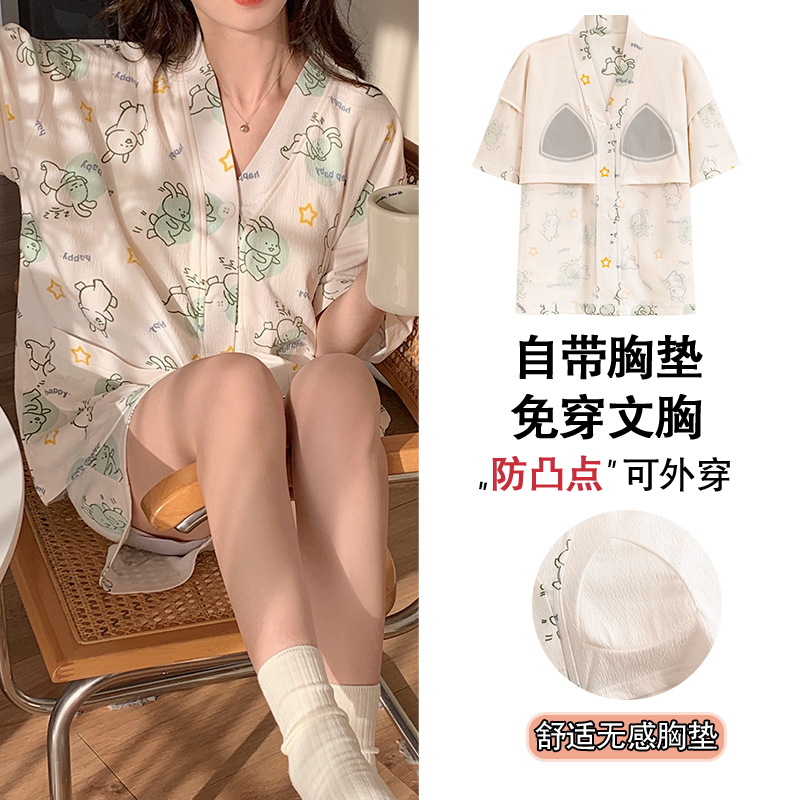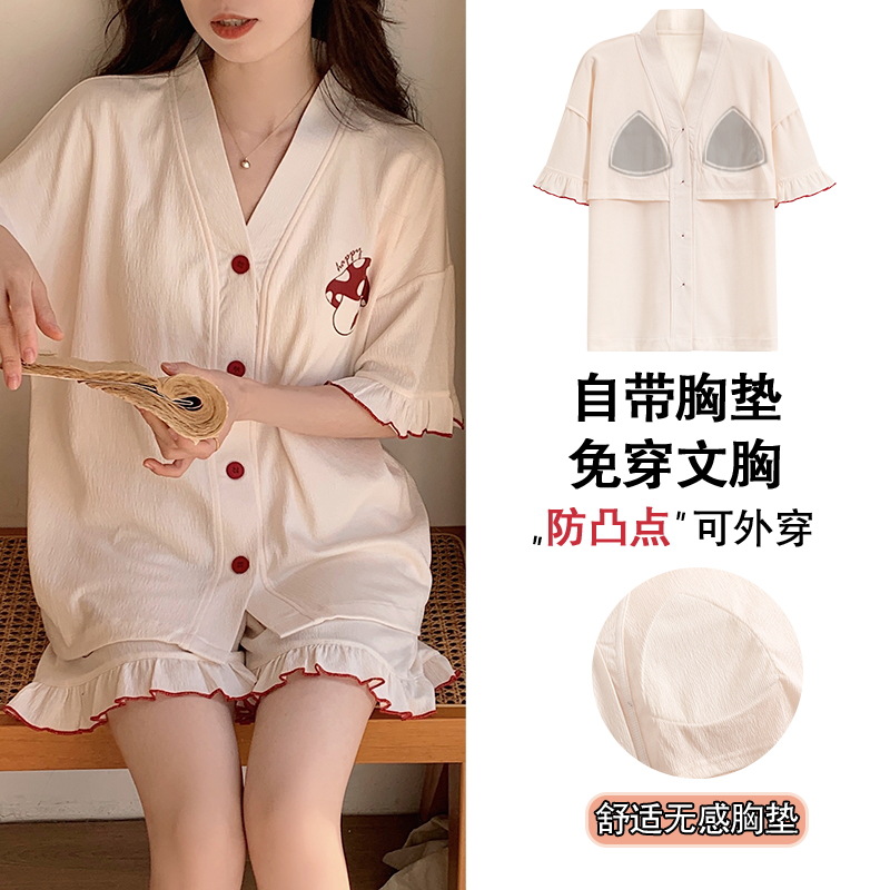 여성용 가슴 패드가 있는 스타일 잠옷, 여름용 얇은 가디건, 외부에서 착용할 수 있는 브이넥 반팔 슈트, 달콤한 공주 스타일 홈웨어