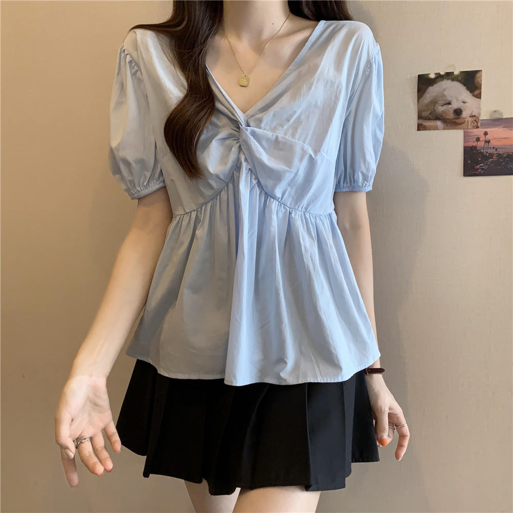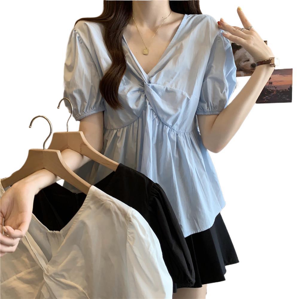 블랙 퍼프 소매 반팔 쉬폰 셔츠 여성용 여름 플러스 사이즈 통통녀 타이트한 허리 슬리밍 인형 셔츠 V넥 세련된 탑