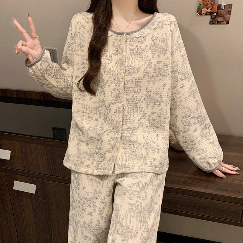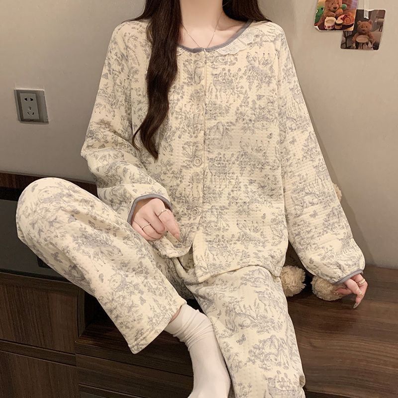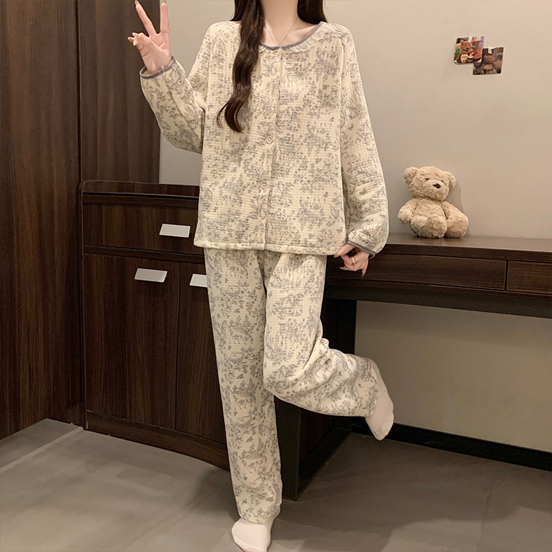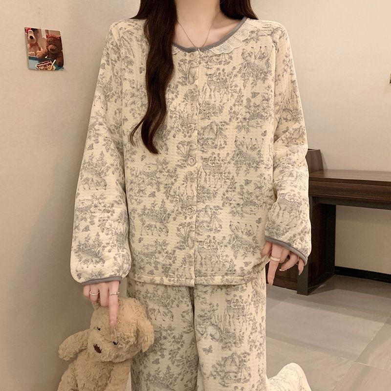 여성용 겨울 신상 잠옷, 에어 레이어 라운드넥 가디건, 긴팔 긴바지, 편안하고 따뜻한 홈웨어 투피스 세트