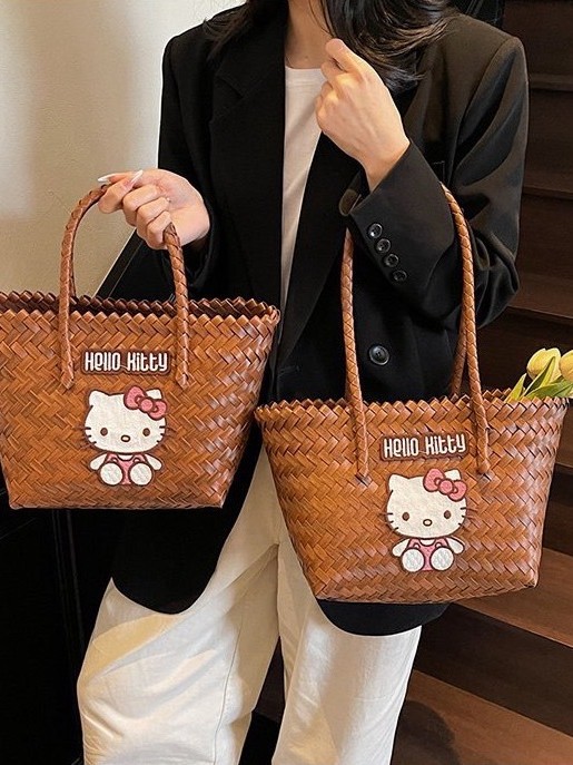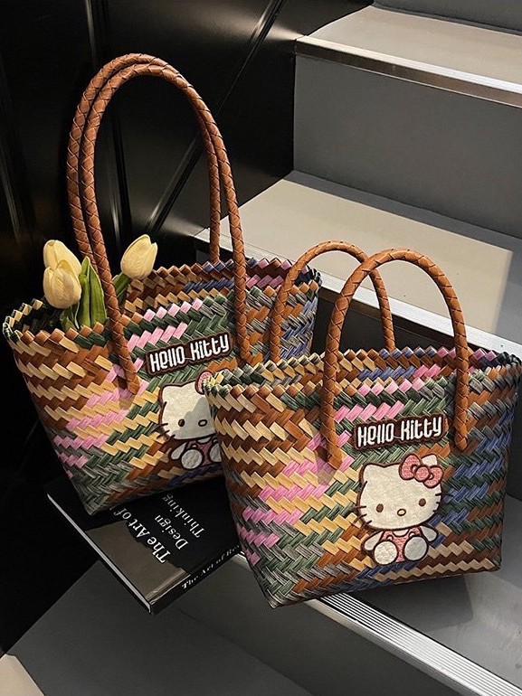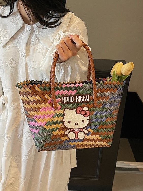 일본 스타일 Ins 틈새 디자인 만화 귀여운 키티 밀짚 가방 여름 올 매치 홀리데이 스타일 싱글 숄더 핸드백 여성