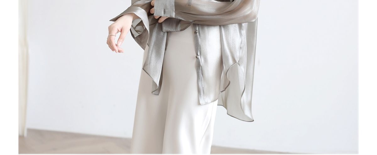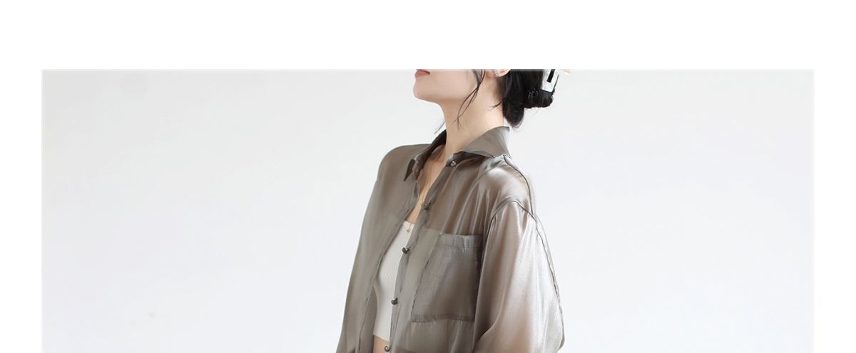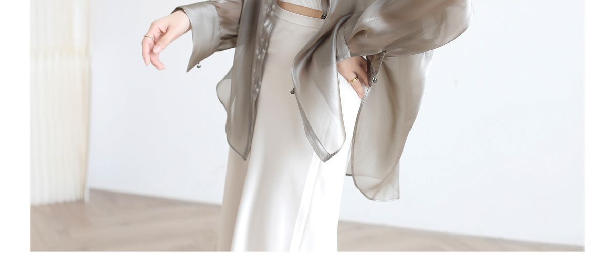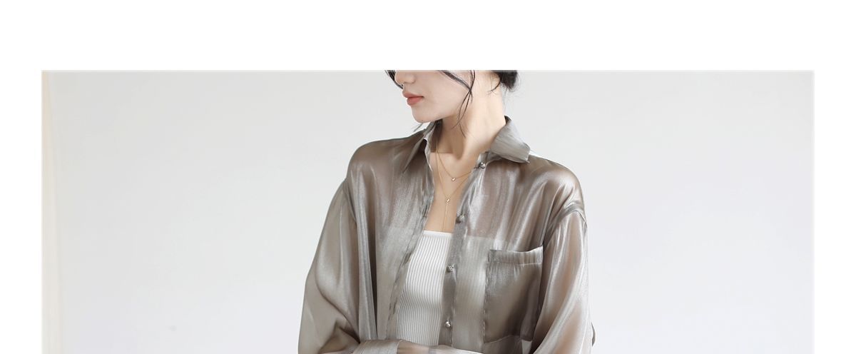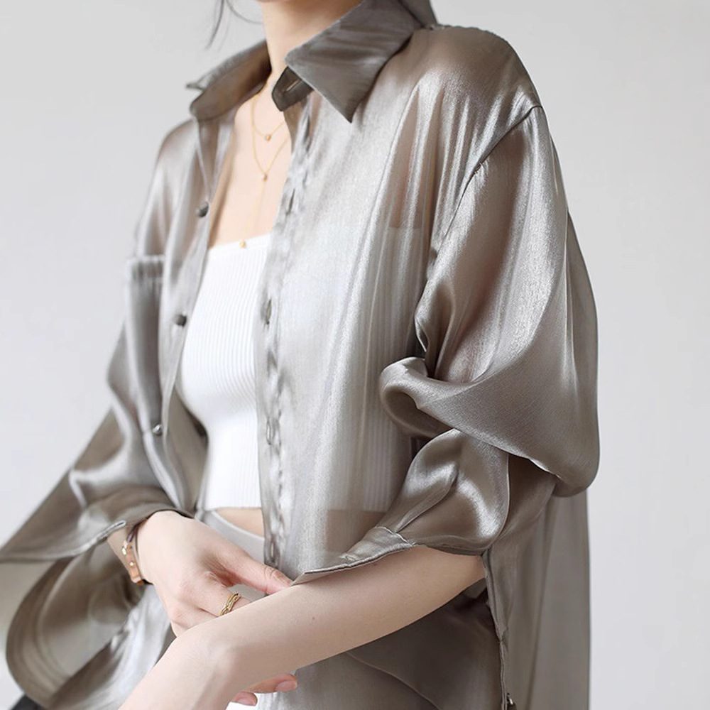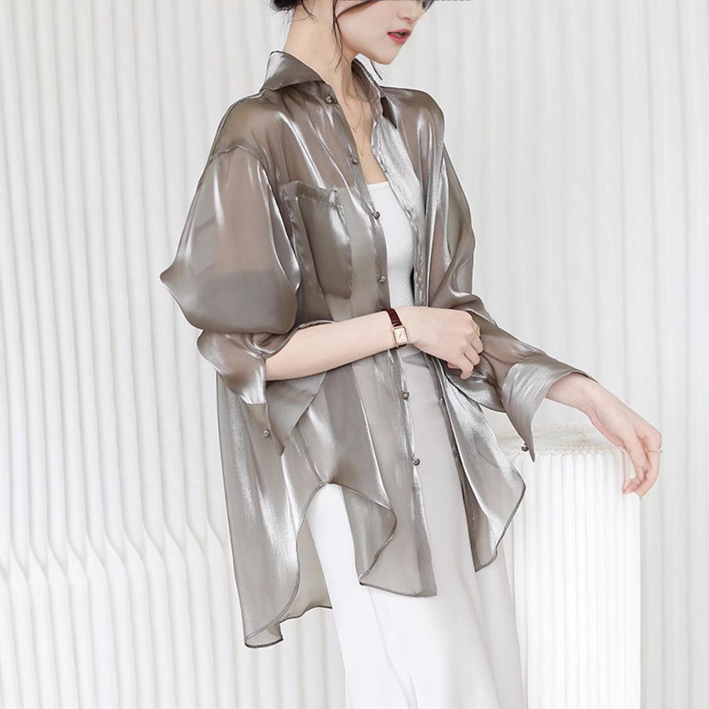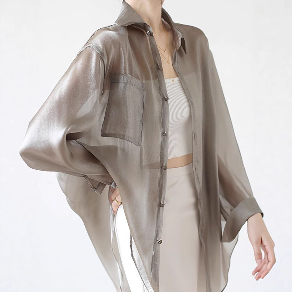 아이스 실크 선스크린 여성 2025 여름 얇은 셔츠 디자인 불규칙한 블랙 쉬폰 셔츠 재킷