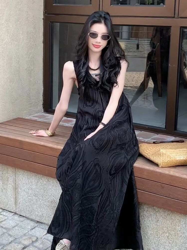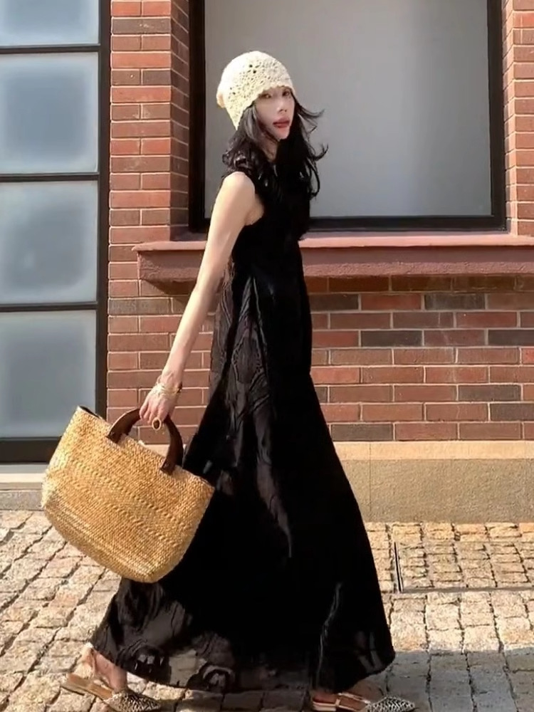 재고 기질 프랑스 헵번 스타일 긴 원피스 아름다운 독특한 아름답고 관대 한 부드러운 검은 원피스 어린이 여름