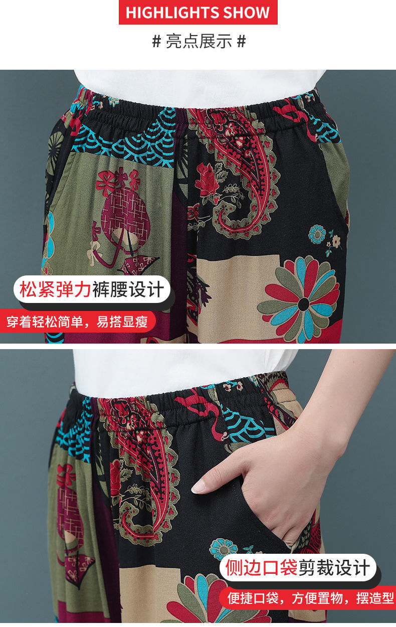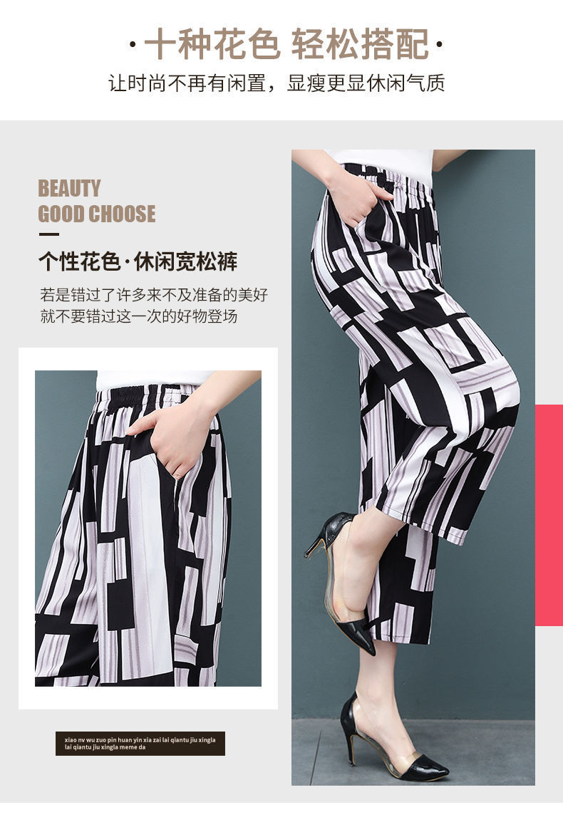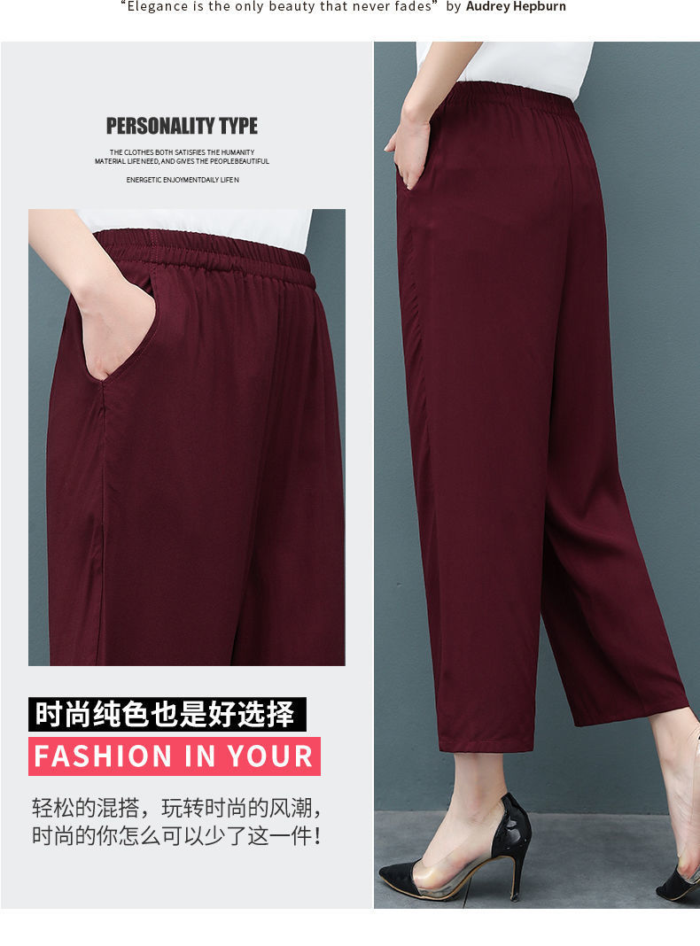 중년 및 노년층 엄마 면 실크 8부 바지 여름 얇은 여성 바지 루즈한 대형 신축성 있는 허리 캐주얼 바지 여성용 스트레이트 팬츠